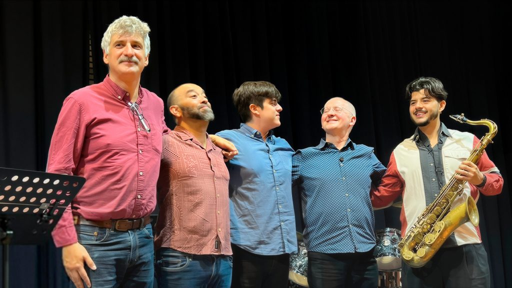 El encuentro fue organizado por el docente Federico Dannemann (guitarra) y contó con la participación de integrantes de distintas etapas formativas de Projazz: también docente Sebastián Prado (guitarra), el estudiante Patricio Bravo (bajo) y el egresado Diego Toro (saxofón), quienes se sumaron a David Jones (batería) para dar vida a un repertorio que recorrió obras y autores fundamentales del jazz.